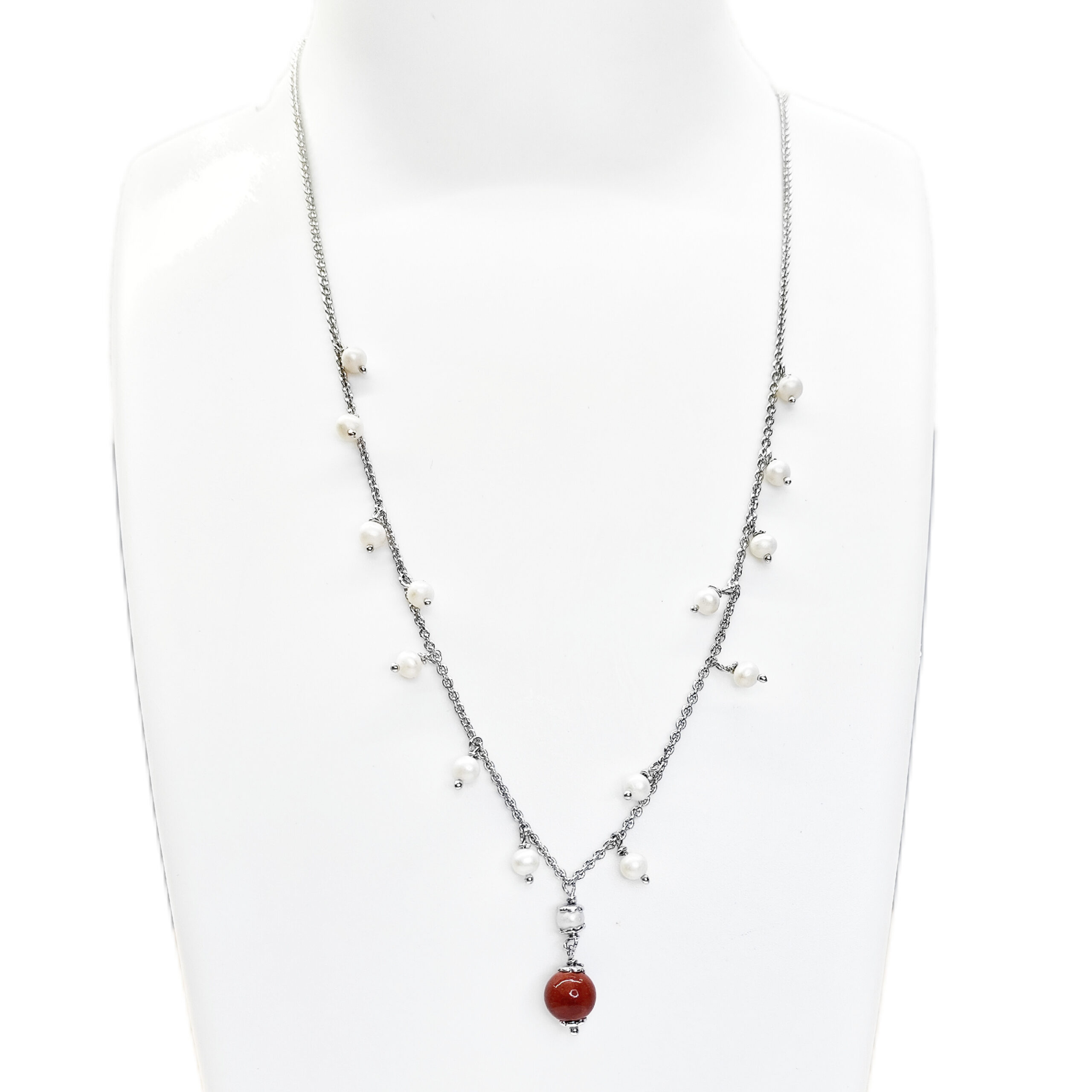 A timeless 92.5 silver neckpiece featuring natural Pearls and Carnelian—Pearls for elegance, calm, and grace, and Carnelian for confidence and vitality. Sophisticated yet versatile, it’s ideal for casual wear, beautifully complementing both western and Indo-western styles.